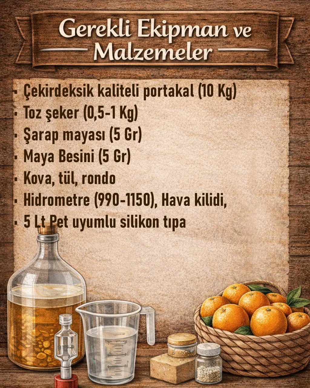 Evde portakal şarabı yapımı için temel ekipman ve malzemeler şunlardır: çekirdeksiz ve olgun portakal, toz şeker, şarap mayası, maya besini, fermantasyon kovası, hidrometre, hava kilidi ve silikon tıpa.