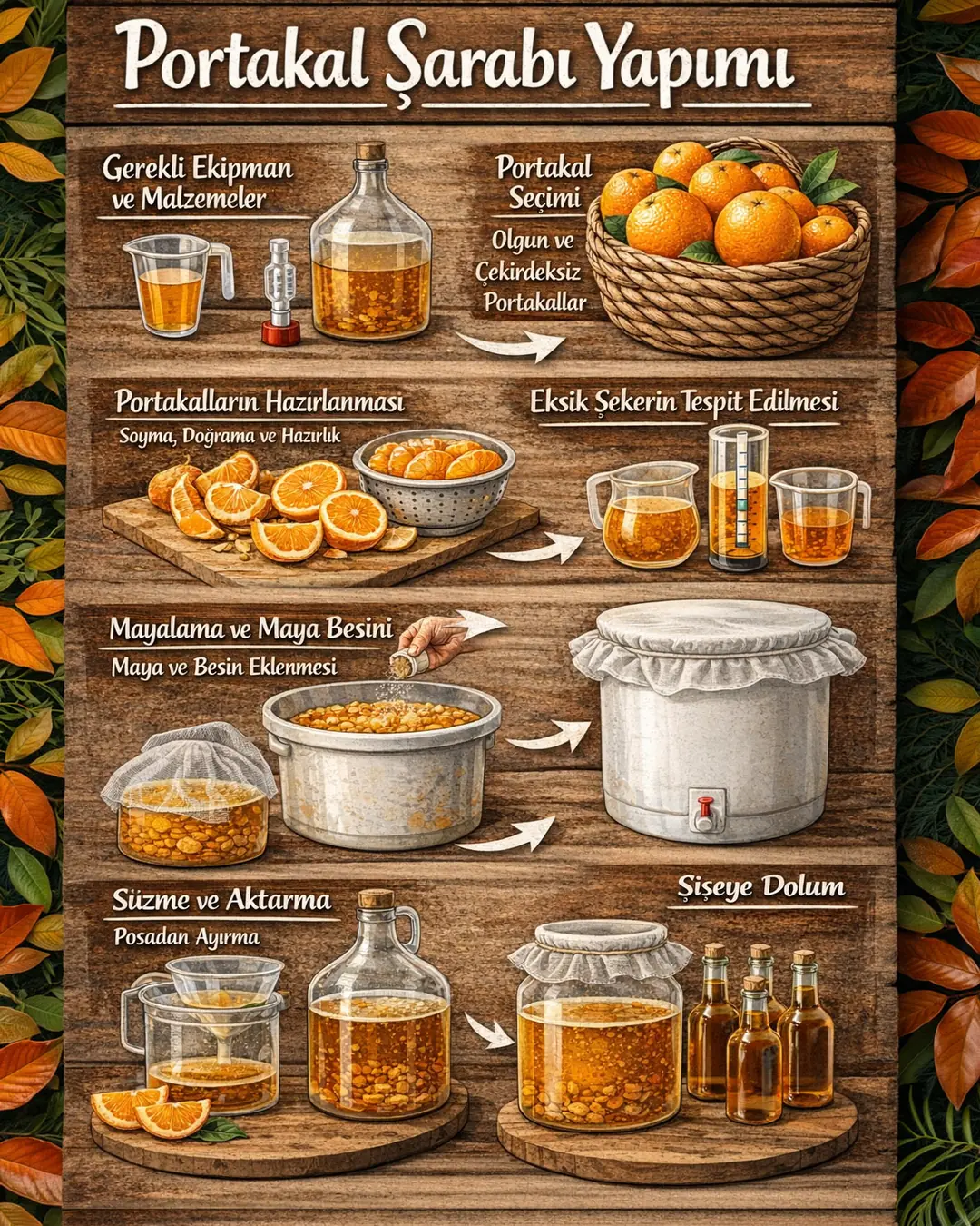 Evde portakal şarabı yapımı, doğru ekipman ve doğru şeker hesabı ile oldukça başarılı sonuçlar verir. Bu rehberde, portakal seçimi, fermantasyon süreci ve şeker ayarlaması adım adım anlatılmaktadır.