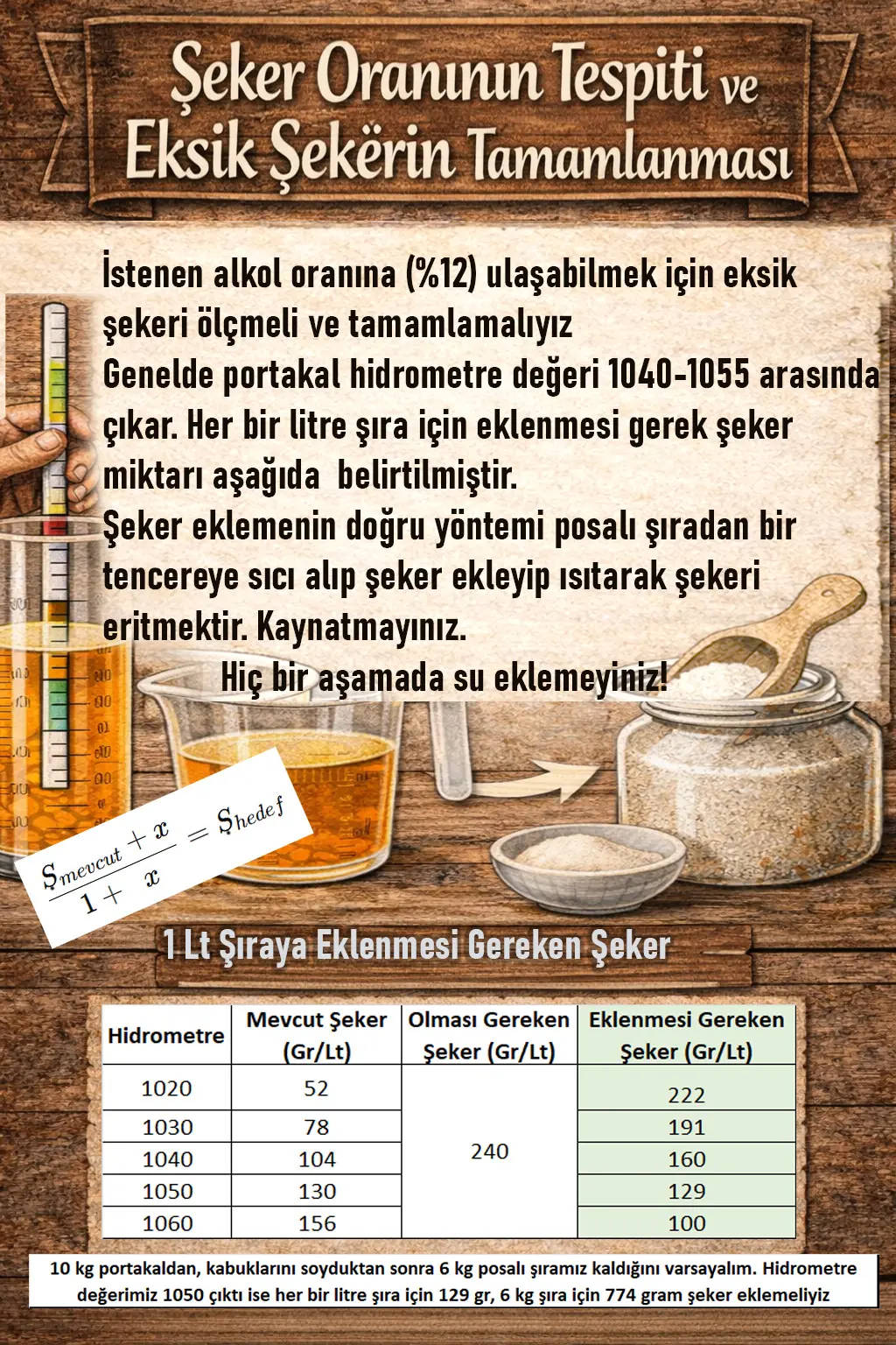 Portakal şırasının hidrometre değeri genellikle 1040–1055 aralığında ölçülür. Yaklaşık %12 alkol elde edebilmek için eksik şekerin hesaplanarak eklenmesi gerekir. Şeker, şıradan alınan bir miktar sıvı içerisinde ısıtılarak eritilmeli, hiçbir aşamada su eklenmemelidir.